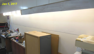 The FRP panel has been extended nearly down to the far corner of the room above the work bench. The test layout with the Kato Unitrack was moved to the shorter wall to make way for this. The lighting valance under the cabinets has also been extended but not quite as far.
